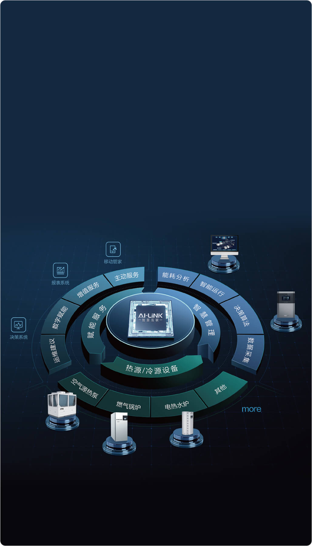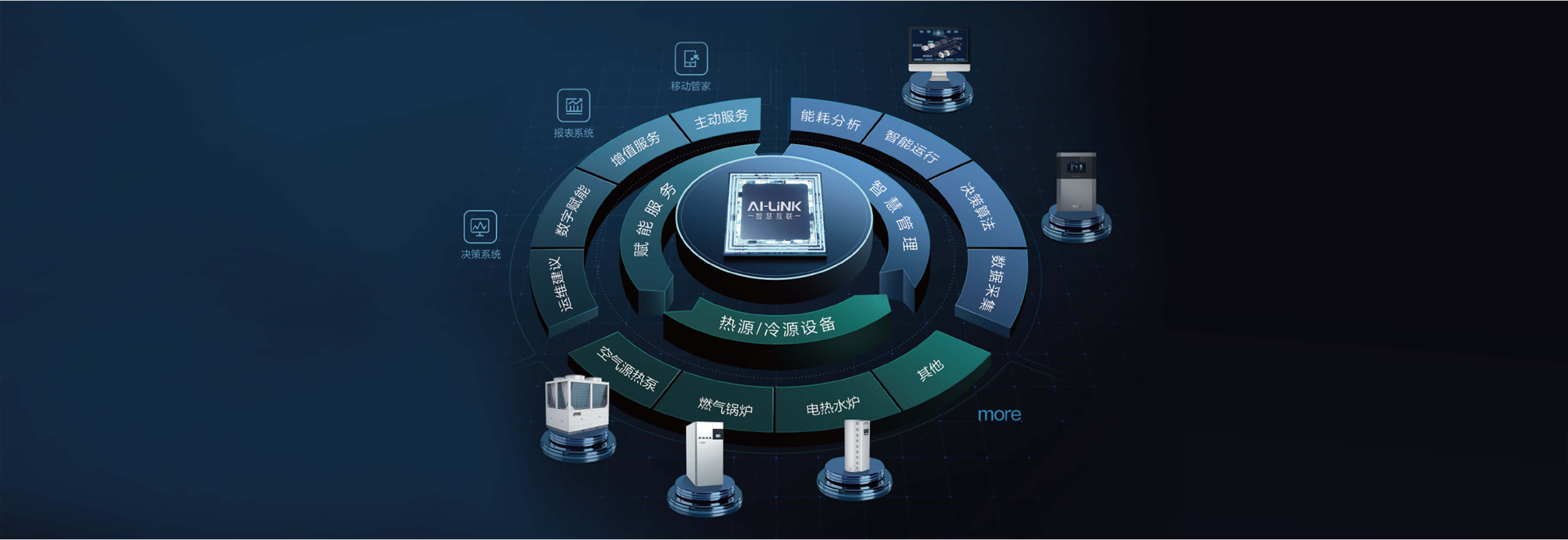 AI-LiNK将单一能源设备迭代为多能源设备耦合,平衡初投资和运行费用,优化耦合系统配置; 根据用热需求、环境温度、能源价格、系统状态等因素,将能源设备高效耦合,以节费策略控制设备运行状态,降低供热运行费用