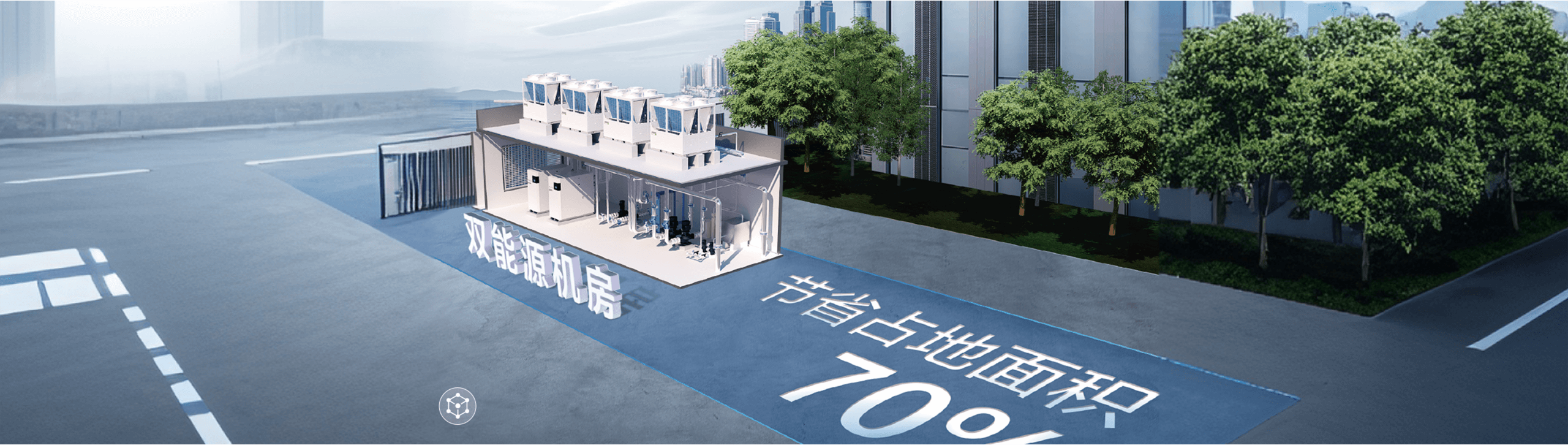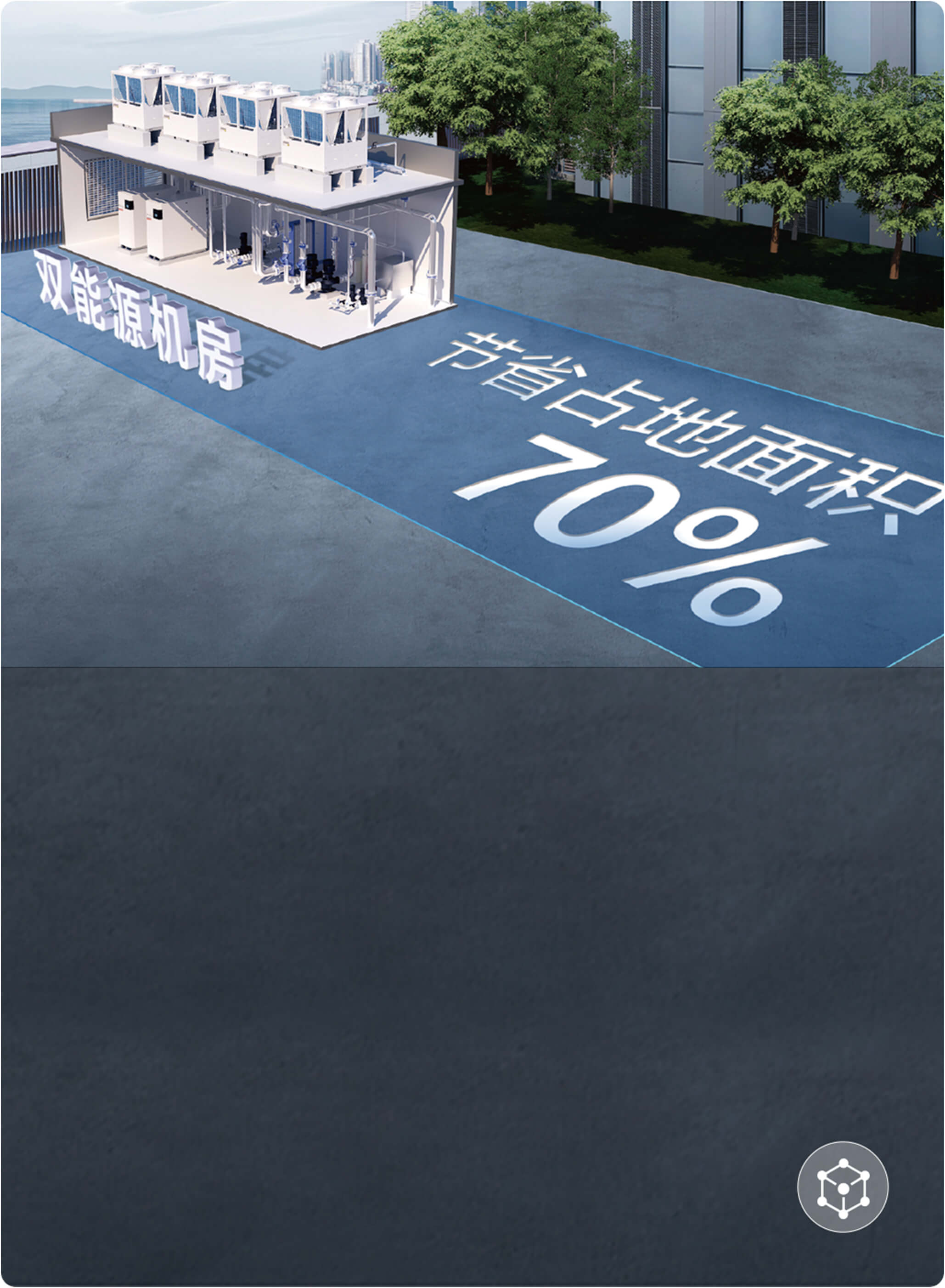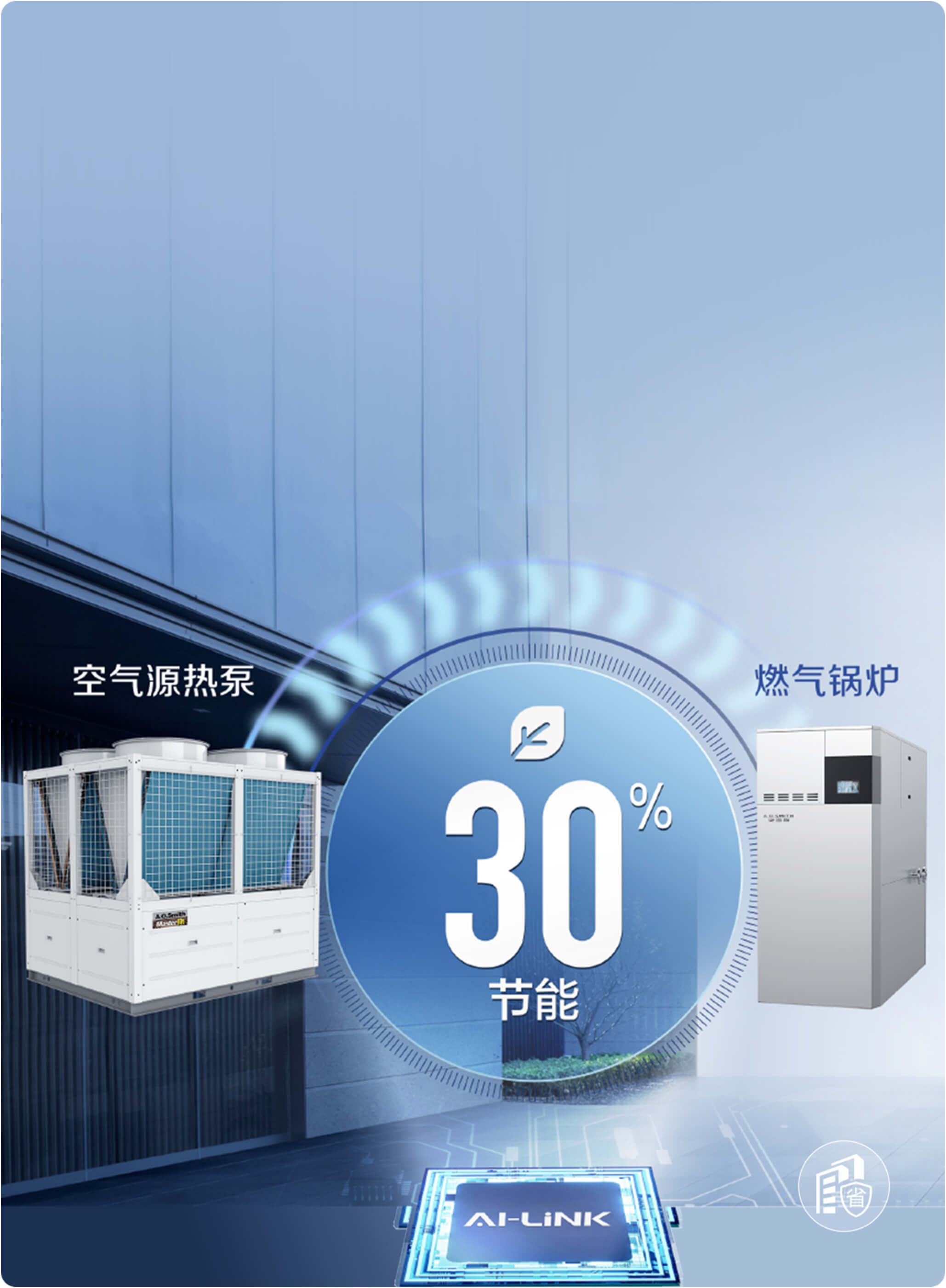 注:“占地节省70%”:4万m2住宅供暖,使用传统空气源热泵占地面积约380m2,A.O.史密斯AI-LiNK双能耦合系统占地