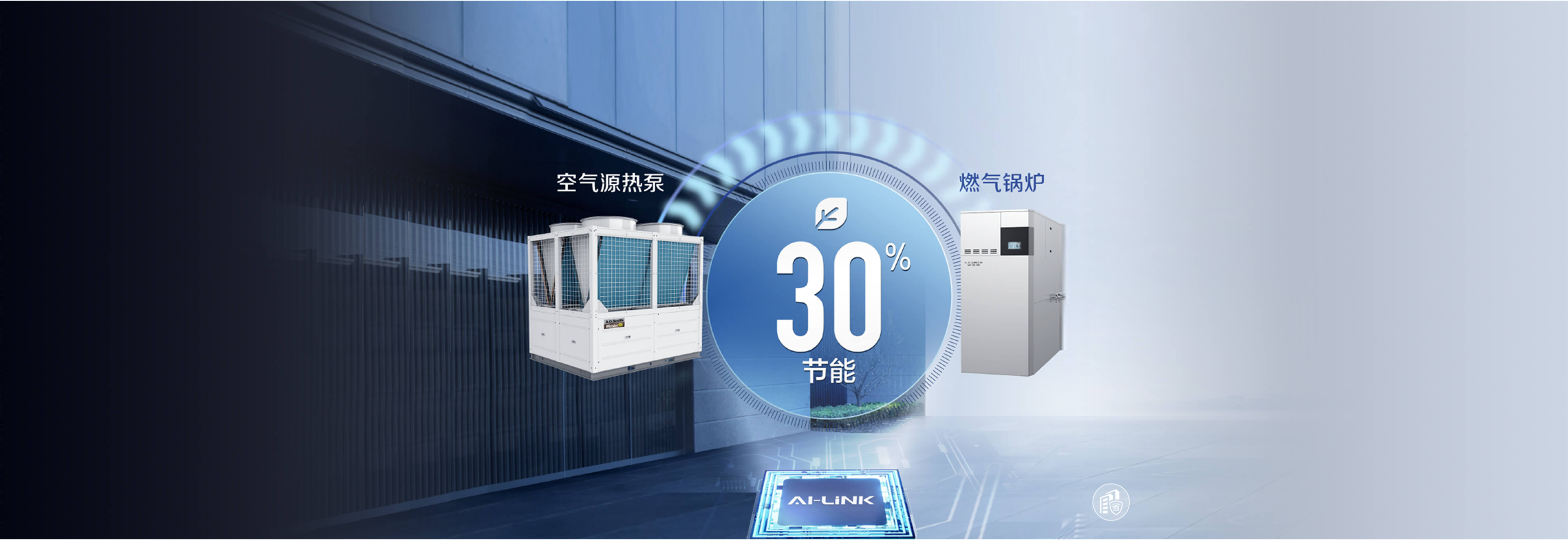 AI-LiNK充分发挥空气源热泵节能减排优势,智能调用燃气锅炉作为热源保障,实现舒适与节费、低碳精妙结合